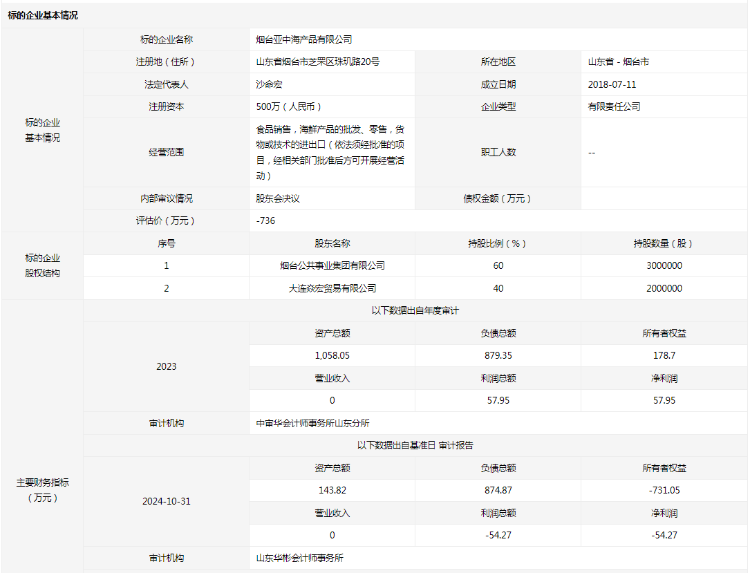 煙臺亞中海產(chǎn)品有限公司60%國有股權