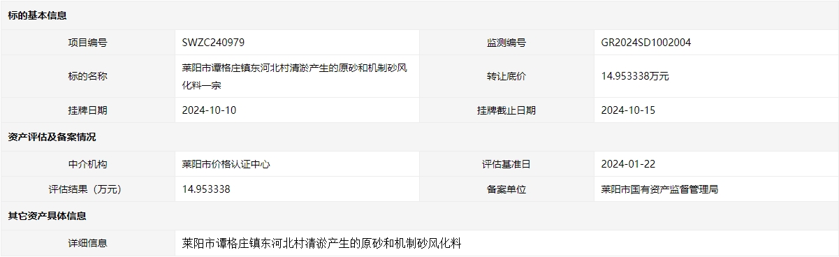 萊陽市譚格莊鎮(zhèn)東河北村清淤產(chǎn)生的原砂和機制砂風(fēng)化料一宗