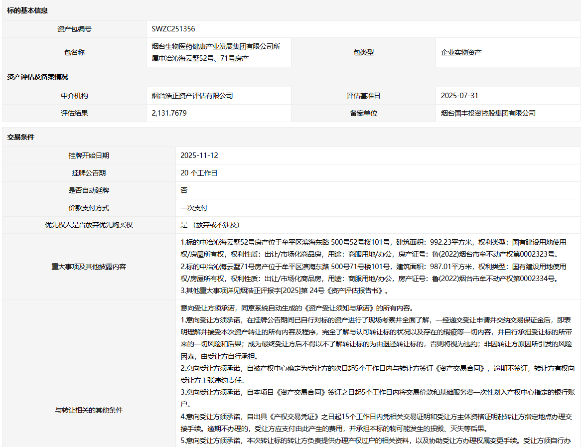 煙臺生物醫(yī)藥健康產(chǎn)業(yè)發(fā)展集團有限公司所屬中冶沁海云墅52號、71號房產(chǎn)