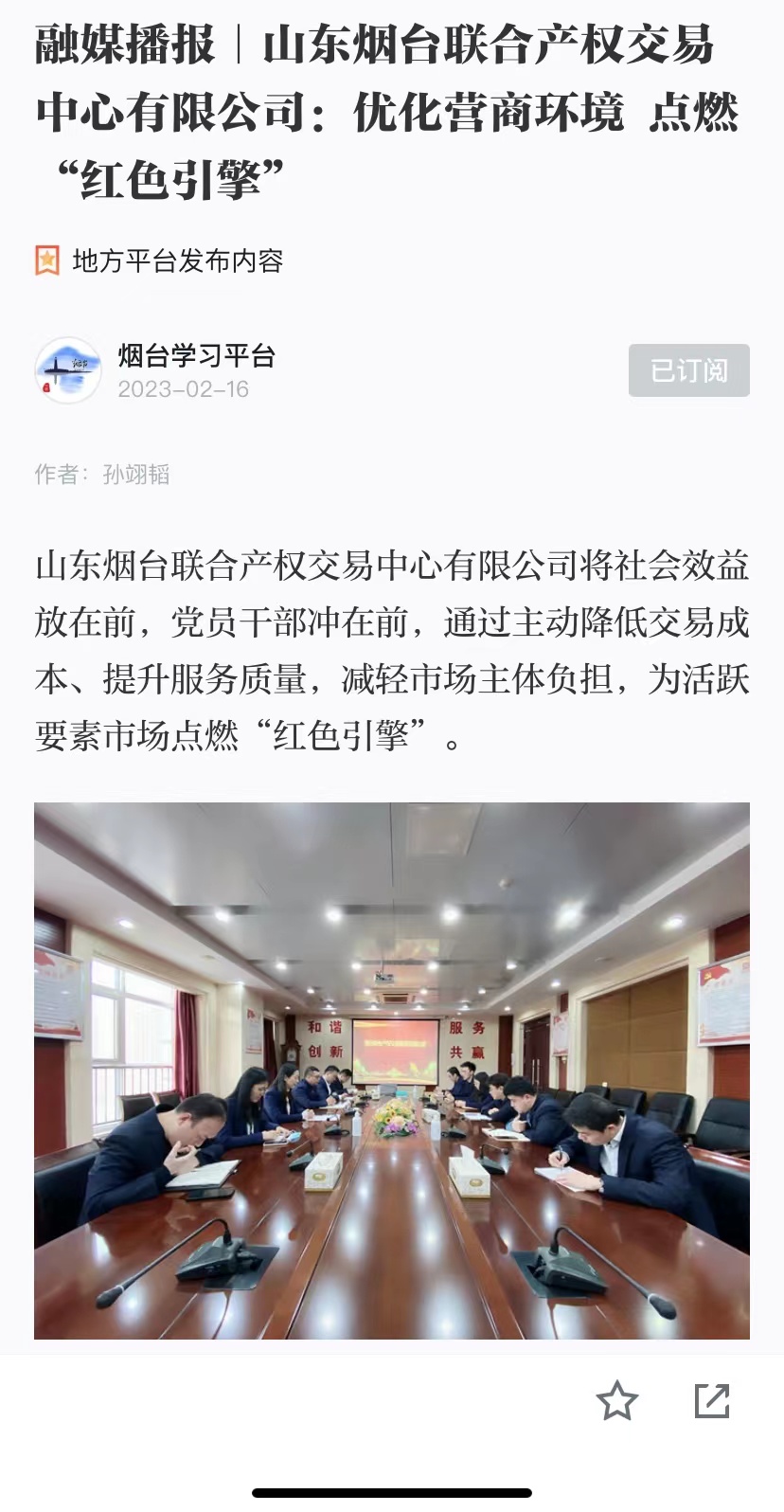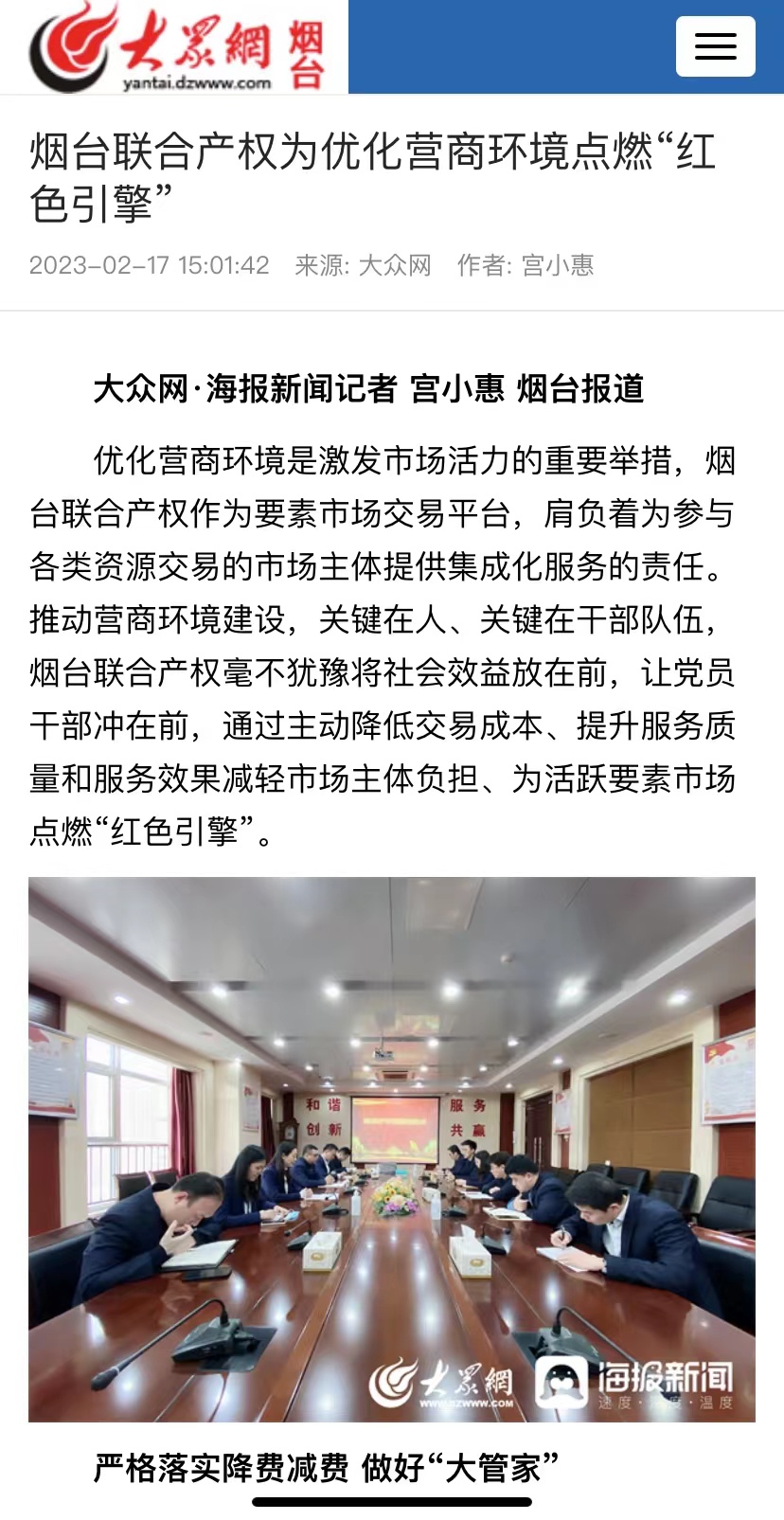 近日,“學(xué)習(xí)強(qiáng)國”煙臺(tái)平臺(tái)、煙臺(tái)日?qǐng)?bào)社大小新聞網(wǎng)、大眾網(wǎng)煙臺(tái)刊發(fā)署名文章《煙臺(tái)聯(lián)合產(chǎn)權(quán)為優(yōu)化營商環(huán)境點(diǎn)燃“紅色引擎”當(dāng)好市場“店小二”》,全面介紹了2022年煙臺(tái)聯(lián)合產(chǎn)權(quán)作為要素市場交易平臺(tái),肩負(fù)著為參與各類資源交易的市場主體提供集成化服務(wù)的責(zé)任,在推動(dòng)營商環(huán)境建設(shè)方面,毫不猶豫將社會(huì)效益放在前,讓黨員干部沖在前,通過主動(dòng)降低交易成本、提升服務(wù)質(zhì)量和服務(wù)效果減輕市場主體負(fù)擔(dān)、為活躍要素市場點(diǎn)燃“紅色引擎”。